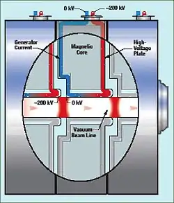 Each electron accelerator consists of a long row of doughnut-shaped magnetic induction cells, each connected to a high-voltage generator. There are 74 in total in each accelerator but not all may be used. At the instant of firing, each generator discharges its power, creating a pulse of electric current through its induction cell, which in turn creates a large voltage difference across the gap separating that cell from its neighbor. The electron beam-pulse travels through the central bore of the cells, receiving a 200 keV energy kick each time it passes through a gap.