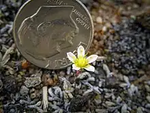 A plant with a sole flower compared to a dime.