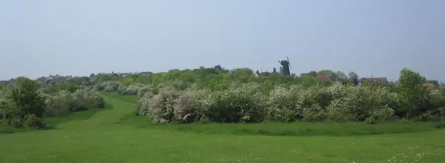 A view across part of the downs to the windmill and showing the mass of hawthorn in bloom