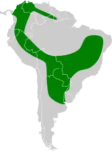 The dwarf dog-faced bat is found only in South America, with a wide range encompassing Argentina, Bolivia, Brazil, Colombia, Ecuador, Guyana, Paraguay, Peru, Uruguay, and Venezuela.[1] The proposed subspecies M. t. sylvia is known from Corrientes Province, Argentina and Uruguay. Molossops temminckii griseiventer is known from Colombia in the Magdalena River Valley, as well as the Tolima, Meta, and Cundinamarca Departments. The nominate subspecies, M. t. temminckii, has been reported from Paraguay, northern Argentina, and several Brazilian states.[14] The species is generally found in lower altitude areas. The greatest elevation record for this species is 770 m (2,530 ft) above sea level, which was in Colombia. It has been found in a variety of biomes and ecoregions, including the Amazonian lowlands, Cerrado (tropical savanna), Caatinga (dry shrubland), Pantanal (wetlands), Atlantic Forest, Alto Paraná Atlantic forests, and Argentine Espinal.[3]
