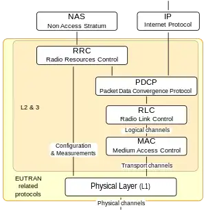 • RRC:[8] Between others it takes care of: the broadcast system information related to the access stratum and transport of the non-access stratum (NAS) messages, paging, establishment and release of the RRC connection, security key management, handover, UE measurements related to inter-system (inter-RAT) mobility, QoS, etc..