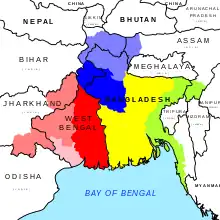 - ↑ Chatterji 1926, p. 139: "In the border districts of the delta, namely, South Faridpur, East Nadiya, West Jessore, West Khulna, the Rāḍha and Vaŋga forms intermingle, where Rāḍha influences Vaŋga."