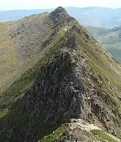 The Eastern Fells occupy the region between the A591 Keswick to Ambleside road and the lake of Ullswater to the west. The Helvellyn range forms the main spine of the group, running on a north–south axis and remaining above 2,000 ft throughout its length. To the south of the Helvellyn range, across the depression of Grisedale Hause, is the Fairfield group of fells. There are also a number of subsidiary ridges and outliers, particularly to the east of the main range.