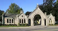 The entrance to Mt. Elliott Cemetery is through a stone gateway designed and built by Walter Schweikart in 1882 at a cost of $6,000.[4] Schweikart also built the entrance to the nearby Elmwood cemetery.[4]