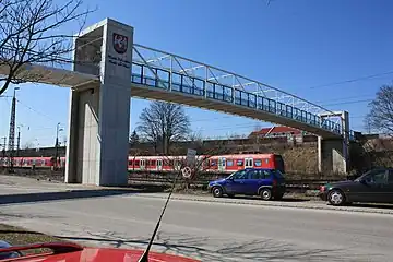 Footbridge over railways in Markt Schwaben, Bavaria, Germany. Coat of Arms of Markt Schwaben on the bridge