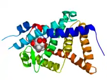 ![]() Crystallographic structure of the ligand binding domain of the ecdysone receptor (rainbow color, N-terminus = blue, C-terminus = red) from Heliothis virescens complexed with ponasterone A (space-filling model, carbon = white, oxygen = red).[1] | |||||||