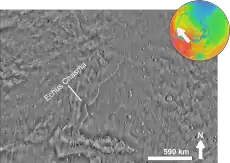 Echus Chasma is approximately 100 km long and 10 km wide, with valleys ranging in depth from around 1 km to 4 km.[1] It is the source region of the Kasei Valles outflow channel, which extends northward from it. It is situated just west of Hebes Chasma, to which it does not connect.