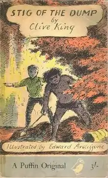 For illustrating Titus in Trouble, written by James Reeves, Ardizzone was a commended runner-up for the 1959 Greenaway Medal.[14][lower-alpha 1] Ardizzone is particularly noted for having not just illustrated the covers and contents of books, but inked in the title text and author's name in his own hand, giving the books a distinctive look on shelves. An example is Clive King's Stig of the Dump from 1963. The Nurse Matilda series of children's books (1964–74) was written by his cousin Christianna Brand, who was seven years younger. Their shared grandmother had told the stories to both cousins and she had learned them from her father.