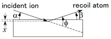 Impinging ions reach the surface, making an angle θ1, with the inward-pointing normal to the surface. After collision their velocity makes an angle θ1, with the outward surface normal; and the atom initially at rest recoils, making an angle θ1, with this normal. Detection is possible at one of these angles as such that the particle crosses the target surface. Paths of particles are related to collisional depth x, measured along a normal to the surface.[28]