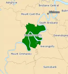 The district was based in the western suburbs of Brisbane, and straddled both sides of the Brisbane River. It was named for the suburb of Indooroopilly and also included the suburbs of Chelmer, Fig Tree Pocket, Graceville, Sherwood, St Lucia and Taringa. After a redistribution in 2008 it included parts of Tennyson. It was first created for the 1992 election.