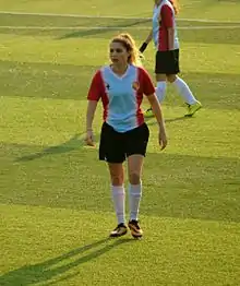 She made her first appearance in the women's national team on 3 February 2010 playing in a friendly match against the Russian team.[8] She participated in the qualifying round matches of UEFA Women's Euro 2013 qualifying – Group 2 and 2015 FIFA Women's World Cup qualification – UEFA Group 6. As of 19 June 2014 she capped 7 times in the national team.[1]