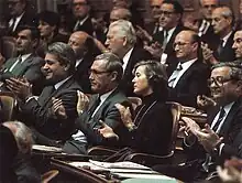 In 1970, Elisabeth Kopp became a municipal councilor (Gemeinderat) of Zumikon, and in 1974 the first female president of a municipality in the canton of Zurich.[4] In February 1971, just days ahead of the national women's suffrage referendum, she took part in a panel in the casino in Wohlen for the yes campaign.[14] Between 1972 and 1979, she served on the executive council of the canton of Zürich as a representative for the FDP.[4] For the FDP, Kopp was a candidate to the National Council in the Federal Elections of 1975 supported from the Women Central of Zurich and even though she was not elected, received an encouraging result.[15] For the Federal Election of 1979, she campaigned focusing on her experience as the president of Zumikon.[15] She would be elected with 52,113 votes.[15] As a member of the FDP, she served in the National Council of Switzerland from 1979 to 1984.[16] For the first seven sessions she mainly observed and only introduced one motion demanding from the Federal Council to examine the possibilities for encouraging saving.[17]