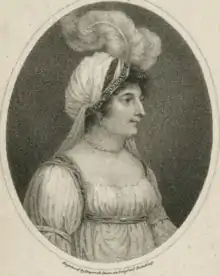 In 1791 she was kind enough to take in Elizabeth Clendining who she had met in Dublin. Clendinning had a short singing career before she retired to have a family, but her husband was in Dublin debtors' prison and she came to England to find work and she found work initially in Bath.[7] Mrs. Billington was not happy in her marriage, and even before she had appeared on the London stage rumour had been busy with her fair fame. In 1792 there appeared an anonymous publication, which professed to contain her private correspondence with her mother. This work was of so disgraceful and scurrilous a description that Mrs. Billington was forced to take legal proceedings against the publishers. An answer to the 'Memoirs' appeared in due course ; but it seems probable that the scandal induced Mrs. Billington to abandon her profession and retire to the Continent. Accompanied by her brother and her husband, she left England early in 1794, and travelled by way of Germany to Italy. At Naples she was induced by Sir William Hamilton, the English ambassador, to sing in private before the royal family. This led to her singing at the San Carlo, where she appeared in a new opera, 'Inez di Castro,' written expressly for her by Francesco Bianchi, on 30 May 1794. Her singing created an extraordinary impression, but her triumph was cut short by the sudden death of her husband, which took place the day after her first appearance, as he was preparing to accompany his wife to the theatre, after dining with the Bishop of Winchester. She stayed at Naples sixteen months, and then sang at Florence, Leghorn, Milan, Venice, and Trieste. In 1797, when singing at Venice, she was prostrated with a severe illness for six weeks. On her recovery the opera house was illuminated for three nights. [4]
