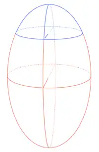Graphical illustration of an ellipsoidal dome. Note the blue and red horizontal "ellipses" are circles, at an angle. The blue and red vertical ellipse is rotated, about its vertical axis. At top in blue is a prolate ellipsoidal dome.