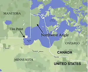 Elm Point, Minnesota, is a small uninhabited[2] cape and a practical exclave of the United States in Lake Township, Roseau County, Minnesota, United States. It is surrounded on the west, south, and east by Lake of the Woods, and on the north by the Canadian First Nation community of Buffalo Point in southeastern Manitoba. Part of Elm Point is privately owned and part of it is state land[3] managed by the Department of Natural Resources as part of the Border Wildlife Management Area.[4] It is located southwest of the much larger exclave known as the Northwest Angle.[5] There is a line of felled trees marking the international border,[6] which runs nominally along the 49th parallel, although in this area it runs slightly to the south[7] due to 19th-century surveying errors.