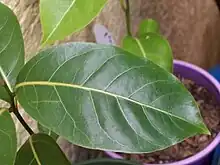 Leaves are broad-elliptic to elliptic or ovate, veiny and usually 7โ15 cm long, 3โ6 cm wide, veins often yellowish. The horizontal form of the branches and attractive dark foliage makes this a particularly beautiful tree.