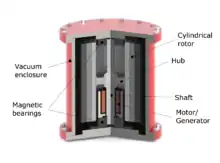 FES systems have rotors made of high strength carbon-fiber composites, suspended by magnetic bearings and spinning at speeds from 20,000 to over 50,000 revolutions per minute (rpm) in a vacuum enclosure.[19] Such flywheels can reach maximum speed ("charge") in a matter of minutes. The flywheel system is connected to a combination electric motor/generator.