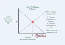 This is the market for shipping pollution. The optimal quantity and the optimal tax per unit of pollution can be found at the intersection of MAC and MD. As the quantity of pollution decreases (emissions), the cost to decrease each marginal unit of pollution increases.