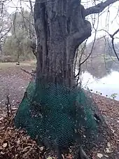 A protective net against beavers on a tree in a Warsaw park, Poland