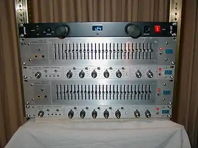The Langevin Model EQ-251A was the first equalizer to use slide controls. It featured two passive equalization sections, a bass shelving filter, and a pass band filter. Each filter had switchable frequencies and used a 15-position slide switch to adjust cut or boost.[9] The first true graphic equalizer was the type 7080 developed by Art Davis's Cinema Engineering. It featured 6 bands with a boost or cut range of 8 dB. It used a slide switch to adjust each band in 1 dB steps. Davis's second graphic equalizer was the Altec Lansing Model 9062A EQ. In 1967 Davis developed the first 1/3 octave variable notch filter set, the Altec-Lansing "Acousta-Voice" system.[8]