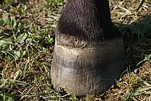 Chronic lameness will change the shape of the hoof capsule, since the lame limb is not weighted as much as its partner, making the capsule more upright, narrow, with a higher heel on the lame limb and more flattened on the sound one.[10] Hoof or horseshoe wear can indicate breakover and if the horse is dragging its toes. Change in shape of the hoof wall is also common in horses with laminitis. "Founder rings," or thickened concentric rings in the hoof wall, indicate a past episode of laminitis. Concavity of the dorsal (front) surface of the hoof can indicate chronic laminitis. The sole may become convex if the coffin bone begins to push through the bottom of the hoof.[19]