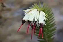 E. recurvata is a shrub of some 30 to 60 centimetres (12 to 24 inches) in height. It has dense whorls of small needle-like leaves which are pale green to grey-green in colour, and recurving in habit, hence the specific name. Clusters of sticky, pendulous flowers appear in winter, having white sepals, dark brown to almost black corollas, and with long, red, exserted styles.