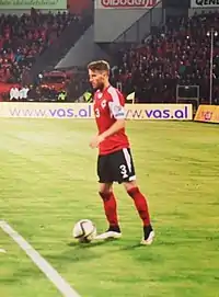 He made his debut for Albania on 15 November 2013 in a friendly match, the first one after the end of the qualification campaign against Belarus playing the full 90 minutes match, which finished in a 0–0 draw.[33][34] He received another call up for the next friendly match on 5 March 2014 against Malta.[35]