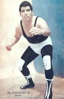 In the late 1950s Vázquez adopted a new ring character, the masked wrestler, character El Espanto ("the Terror" or "The Horror"). As El Espanto he would wear all black and white ring gear, including a black mask with a broad, white cross on the front of the mask. A few months later Cisnero was given the character "Espanto II" (with Vázquez becoming "Espanto I") and thus the team of Los Hermano Espantos ("The Terror brothers") or Los Espantos was created.[4] Ramos recommended Espanto I to the Mexico City promoters of Empresa Mexicana de Lucha Libre ("Mexican Wrestling Enterprise"; EMLL) where he made his EMLL debut on December 16, 1959 in EMLL's Arena Coliseo.[2] While Espanto I worked in Mexico City, Espanto II was gaining more experience locally before being called up to Mexico City as well.[2] Los Hermanos Espanto made their debut as a team on January 24, 1961, winning a tag team tournament in their debut by defeating Tony López and Kiko Córcega in the finals.[2] As a team they would remain undefeated for 34 weeks in a row on EMLL's regular Tuesday night show. Due to their success and fan reaction Los Espantos soon started working regularly on EMLL's Friday night Super Viernes show, EMLL's main show. During their run as a team they wrestled against Lou Thez, the visiting NWA World Heavyweight Champion, with Thez teaming up with Blue Demon on one occasion and Huracán Ramírez on another.[2]