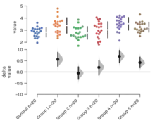 For multiple groups, Geoff Cumming introduced the use of a secondary panel to plot two or more mean differences and their confidence intervals, placed below the observed values panel;[3] this arrangement enables easy comparison of mean differences ('deltas') over several data groupings. Cumming plots can be generated with the ESCI package, DABEST, or the Estimation Stats app.