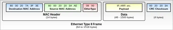 | Layer | Preamble | Start frame delimiter (SFD) | MAC destination | MAC source | 802.1Q tag (optional) | Ethertype (Ethernet II) or length (IEEE 802.3) | Payload | Frame check sequence (32‑bit CRC) | Interpacket gap (IPG) |