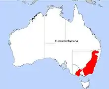 E. macrorhyncha is listed as a least concern species with the International Union for the Conservation of Nature as it is spread over a broad geographic range and has an estimated extent of occurrence of 702,982 km2 (271,423 sq mi) and an estimated area of occupancy of 2,228 km2 (860 sq mi). Although it is also noted that it has a severely fragmented population that is in decline.[1]