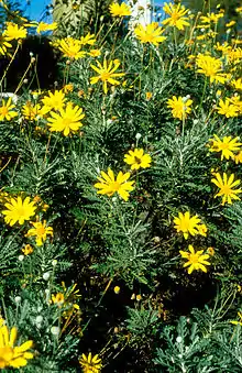 Euryops is a genus of flowering plants in the sunflower family. They are native mostly to rocky sites in southern Africa, with a few species in other parts of Africa and on the Arabian Peninsula.[2][3] They produce daisy-like flowerheads from fern-like foliage.[4] The name Euryops is probably a contraction of the Greek words ευρυς (eurys) meaning 'wide,' and ὄψις (opsis) meaning 'eye,' possibly referring to the large flowerheads compared to the narrow leaves.[5]