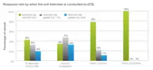 Disadvantages: There are two significant problems with using online surveys for Exit Interviews. The most critical problem is that they identify the wrong drivers of staff turnover[2] Because online surveys do not allow for testing of root cause, the reasons for leaving are not differentiated from issues that caused dissatisfaction but not resignation. In addition there is no ability to ensure that the commentary for each reason for leaving, is consistent with the reason for leaving option they have chosen from a list. The second problem with using online surveys for Exit Interviews is the relatively low completion rate at 34%. This is around half the average completion rate of interviews that are outsourced to external consultants (66%) and around a third of best practice for outsourcing phone interviews (95%).