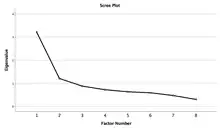 Compute the eigenvalues for the correlation matrix and plot the values from largest to smallest. Examine the graph to determine the last substantial drop in the magnitude of eigenvalues. The number of plotted points before the last drop is the number of factors to include in the model.[9] This method has been criticized because of its subjective nature (i.e., there is no clear objective definition of what constitutes a substantial drop).[18] As this procedure is subjective, Courtney (2013) does not recommend it.[15]