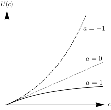 is a variable that the economic decision-maker prefers more of, such as consumption, and is a constant that represents the degree of risk preference ( for risk aversion, for risk-neutrality, or for risk-seeking). In situations where only risk aversion is allowed, the formula is often simplified to .