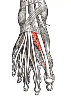 Muscles of the front of the leg. (Ext. hallucis brevis colored in red.)