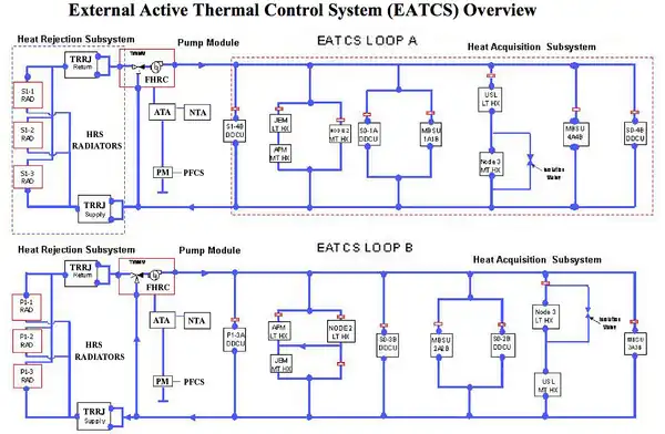 The International Space Station (ISS) External Active Thermal Control System (EATCS)[1] maintains an equilibrium when the ISS environment or heat loads exceed the capabilities of the Passive Thermal Control System (PTCS). Note Elements of the PTCS are external surface materials, insulation such as Multi-Layer Insulation (MLI), or Heat Pipes. The EATCS provides heat rejection capabilities for all the U.S. pressurized modules, the Japanese Experiment Module (JEM), the Columbus Orbital Facility (COF), and the main power distribution electronics of the S0, S1 and P1 Trusses. The EATCS consists of two independent Loops (Loop A & Loop B), which both use mechanically pumped fluid state ammonia in closed-loop circuits. The EATCS is capable of rejecting up to 70 kW, and provides a substantial upgrade in heat rejection capacity from the 14 kW capability of the Early External Active Thermal Control System (EEATCS) via the Early Ammonia Servicer (EAS), which was launched on STS-105 and installed onto the P6 Truss.[1]