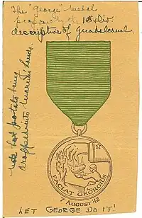 As the division was resting and refitting in Melbourne, Australia after the campaign, Colonel (later Major General) Merrill B. Twining suggested that a commemorative medal be struck. He suggested that the ribbon be made of worn olive drab cotton twill fabric of the USMC M1941 utility uniform and bear the inscription “Let George Do It”, the division's informal motto from its training days when its personnel seemed to draw more than their fair share of onerous assignments. The motto was translated into Latin by British coastwatcher Captain Martin Clemens, who was also awarded the medal. The artist was Captain (later Colonel) Donald L. Dickson, who drew the designs on captured Japanese postcards using a half dollar to draw the circles. The cost to receive a medal was one Australian pound. About 45 officers and senior enlisted men signed up to receive a medal.[2]