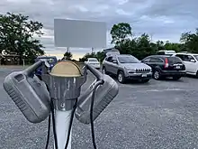 Family Drive-In is open seven days a week from June to August, on the weekends in the spring and fall, and closed during the winter months. The 7.5 acres (3.0 ha) theater includes two screens playing first-run films, though older movies are sometimes played on one of the screens.[1][3][4] The first screen is able to accommodate 240 cars while the smaller second screen, added in 1989, can accommodate 144.[3][2] The double feature policy allows customers to pay one admission price and watch two-first run films. Retro music is played before the films begin and a playground is available for children. Customers are able to hear the film's audio by choosing between drive-in speakers on 4 feet (1.2 m) high poles or their car radio.[1] According to Kopp, the speakers and poles are difficult to maintain since only one manufacturer still makes spare parts for them. When asked if he would ever remove them, Kopp said "Heck no. These classic speakers are part of the drive-in theater experience."[3] A concession stand staffed by "cast members" sells various refreshments, including pizza from a local restaurant and GoPicnic, a healthier option requested by some customers.[3]