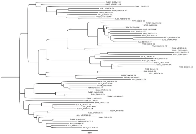 Proteins in a family descend from a common ancestor and typically have similar three-dimensional structures, functions, and significant sequence similarity.[1][2] Sequence similarity (usually amino-acid sequence) is one of the most common indicators of homology, or common evolutionary ancestry.[3][4] A fairly well developed framework exists for evaluating the significance of similarity between a group of sequences using sequence alignment methods. Proteins that do not share a common ancestor are unlikely to show statistically significant sequence similarity, making sequence alignment a powerful tool for identifying the members of protein families.[3][4] Families are sometimes grouped together into larger clades called superfamilies based on structural similarity, even if there is no identifiable sequence homology.