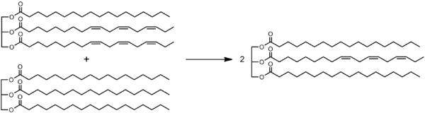 In particular, unsaturated vegetable oil can be interesterified with a fully hydrogenated version thereof, as in the illustration to the right. This procedure yields less saturated fat without creating the trans fat that would be produced by partial hydrogenation.[3] The reaction does not go to completion, and the product will be a mixture of triglycerides with different amounts of saturation.