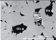 The mineral grains can be dissolved when there is fluid flow. The spaces originally occupied by the minerals will be spare as voids, increasing the porosity of rock.[2] The minerals that are usually dissolved are feldspar, calcite and quartz.[1] Grain dissolution pores results from this process can enhance porosity.