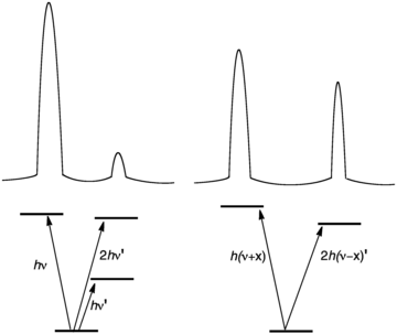Idealized appearance of a normal mode and an overtone before and after Fermi resonance. Beneath the idealized spectra are idealized energy-level schemes.