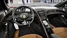 The interior is described by Ferrari as a "2+" interior with a small backseat area. The dashboard features digital instrumentation (a 16.0-inch wrap-around touch screen) and a multi-function steering wheel (both shared with the SF90 Stradale) for the driver. The trim piece running through the center of the interior separates the driver and the passenger and is integrated into the dashboard. A centrally mounted 8.4-inch portrait touch screen controls most of the car's functions. A third horizontal touchscreen can be integrated into the dashboard on the passenger side of the cockpit. This display allows the passenger access to the HVAC, multimedia, and navigation controls and also allows them to view the performance metrics of the car. A newly designed key allows the driver to open the doors of the car with the push of a button near the flush door handles.[8][9][10][11][6]