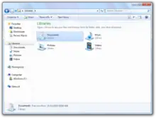 By default, a new user account in Windows 7 contains four libraries, for different file types: Documents, Music, Pictures, and Videos. They are configured to include the user's profile folders for these respective file types, as well as the computer's corresponding Public folders.