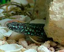 The filfola lizard or Maltese wall lizard (Podarcis filfolensis) is a species of lizard in the family Lacertidae. It is found in Italy (in the Pelagian Islands) and in the island group of Malta. Its natural habitats are Mediterranean-type shrubby vegetation, rocky areas, rocky shores, arable land, pastureland, and rural gardens.