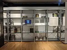 Simulation of a film archive: the shelves have been left almost empty to help visitors better visualize the gap between the number of surviving films and the number of films actually made.