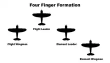 The finger-four formation (also known as the "four finger formation" and the "Fingertip Formation") is a flight formation used by fighter aircraft. It consists of four aircraft, and four of these formations can be combined into a squadron formation.
