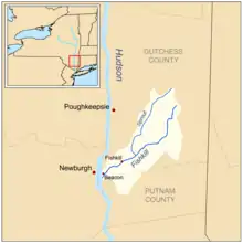 Fishkill Creek (also Fish Kill, from the Dutch vis kille, for "fish creek") is a tributary of the Hudson River in Dutchess County, New York, United States. At 33.5 miles (53.9 km)[2] it is the second longest stream in the county, after Wappinger Creek. It rises in the town of Union Vale and flows generally southwest to a small estuary on the Hudson just south of Beacon. Part of its 193-square-mile (500 km2) watershed[3] is in Putnam County to the south. Sprout Creek, the county's third-longest creek, is its most significant tributary. Whaley and Sylvan lakes and Beacon Reservoir, its largest, deepest and highest lakes, are among the bodies of water within the watershed.
