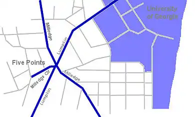 Five Points is a retail corridor and neighborhood in Athens, Georgia, centered on the intersection of Milledge Avenue and Lumpkin Street. It occupies the South-Southwest edge of the University of Georgia campus. Milledge Avenue is home to many University of Georgia Greek chapter houses, and is included in a tour by the Athens Welcome Center.[1]